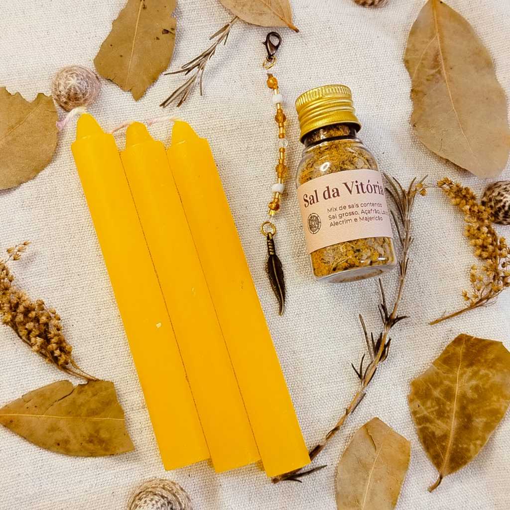Uma garrafinha com sal da vitória (entre 25g e 30g): sal grosso, alecrim, açafrão, louro, majericão.