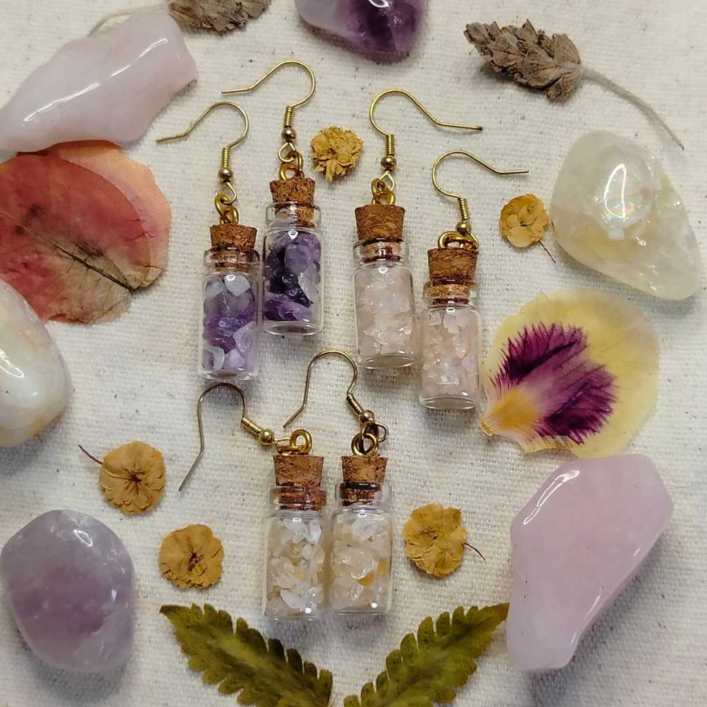 Par de brincos de garrafinha de vidro contendo cascalho de cristais.