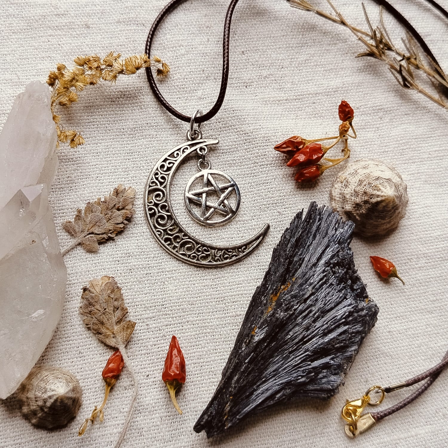 A Lua traz a conexão com o espiritual e o divino, enquanto o pentagrama, um símbolo importante na bruxaria, representa proteção e os 5 elementos: água, terra, fogo, ar e espírito.