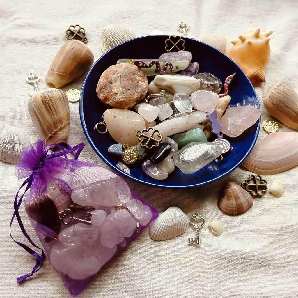 Confete místico com cristais diversos, rolados e brutos, conchas e pingentes esotéricos