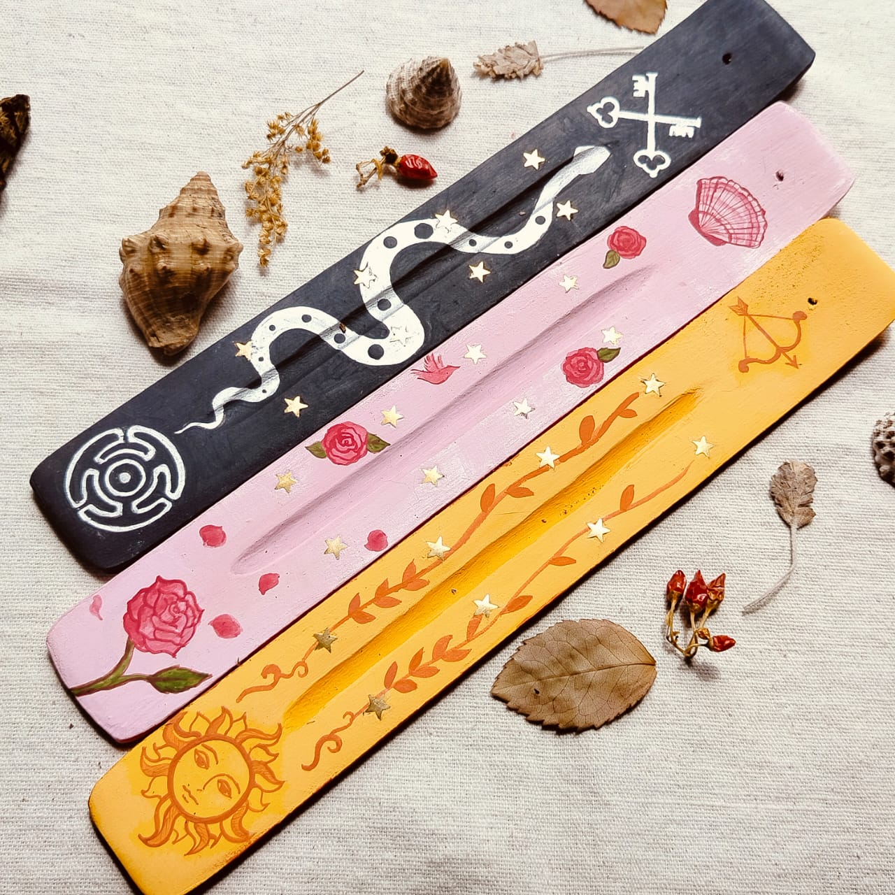 Incensários em rêgua com temas helênicos. Cada um pintado a mão de forma artesanal, com temas e símbolos que representam cada Deus de forma índividual. Perfeito para o seu altar pessoal ou um momento de adoração ou meditação com seu Deus.